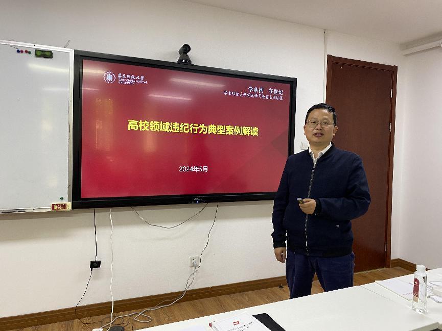 学院党委还邀请校纪委党风廉政与案件审理室主任汪海作辅导报告。汪海以《高校领域违纪行为典型案例解读》为题,对照《条例》相关条款,从政治纪律、组织纪律、廉洁纪律、群众纪律、工作纪律、生活纪律六方面深入解读42个高校领域违纪行为典型案例,与在场师生进行交流研讨,帮助与会师生加深对《条例》的理解和掌握。