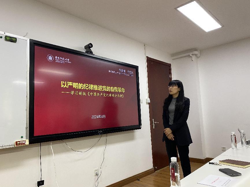 之后,王媛媛以《以严明的几率推进党的自我革命——学习新版〈中国共产党纪律处分条例〉》为题讲授纪律党课。她从《条例》的重要性、《条例》的修订历程、《条例》的框架结构和重要概念、新版《条例》增改重点解读等方面详细领学了《条例》,结合警示案例就学院科研经费、仪器设备采购、举办会议、研究生招生、网络宣传等方面帮助与会师生加深对《条例》的理解。她表示,与会师生党员特别是党委委员,时刻要有纪律意识和规矩意识,要自觉遵守党章党规党纪,在接下来的党纪学习教育中注意发挥领学示范带头作用,把开展党纪学习教育与巩固拓展主题教育成果衔接起来,把党纪学习教育和全面从严治党、干部队伍建设、教师队伍建设、人才培养等各项事业有机融合,促进学院事业高质量发展。