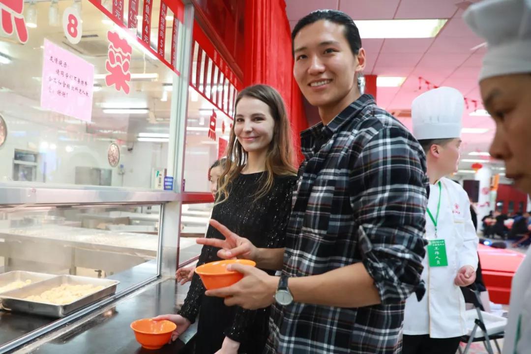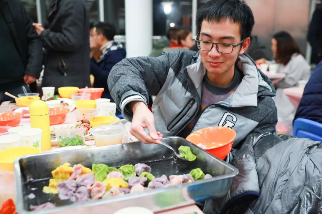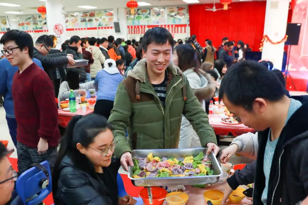 这边精彩的节目轮番上演,那边后勤员工与志愿者们已经将热气腾腾的饺子送到了大家面前。作为中华民族的传统食物,饺子有着独特的文化内涵,而师大特色“彩虹饺子”更饱含了新年五彩斑斓的美好寓意。由食堂大厨亲手剁馅擀皮包的近万只饺子,让同学们品尝到的不仅是舌尖上的美味,更是家的温暖。大家吃着饺子,畅想来年,洋溢着中国传统佳节的喜庆。