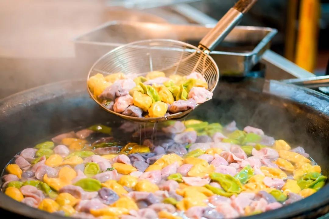 五彩手工水饺:菠菜汁饺皮(白菜猪肉馅)、紫薯饺皮(芹菜猪肉馅)、南瓜饺皮(香菇菜肉馅)、火龙果饺皮(荠菜肉馅)