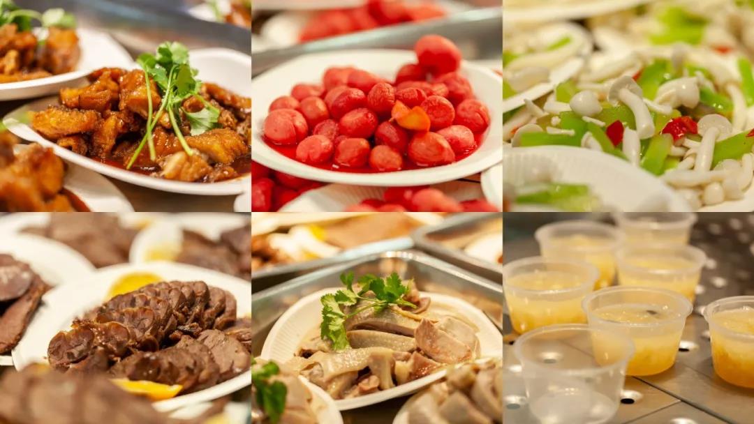 八宝饭、咸草鸡、本帮熏鱼、樱桃萝卜、五香牛肉、碧绿白玉菇、莲子银耳羹