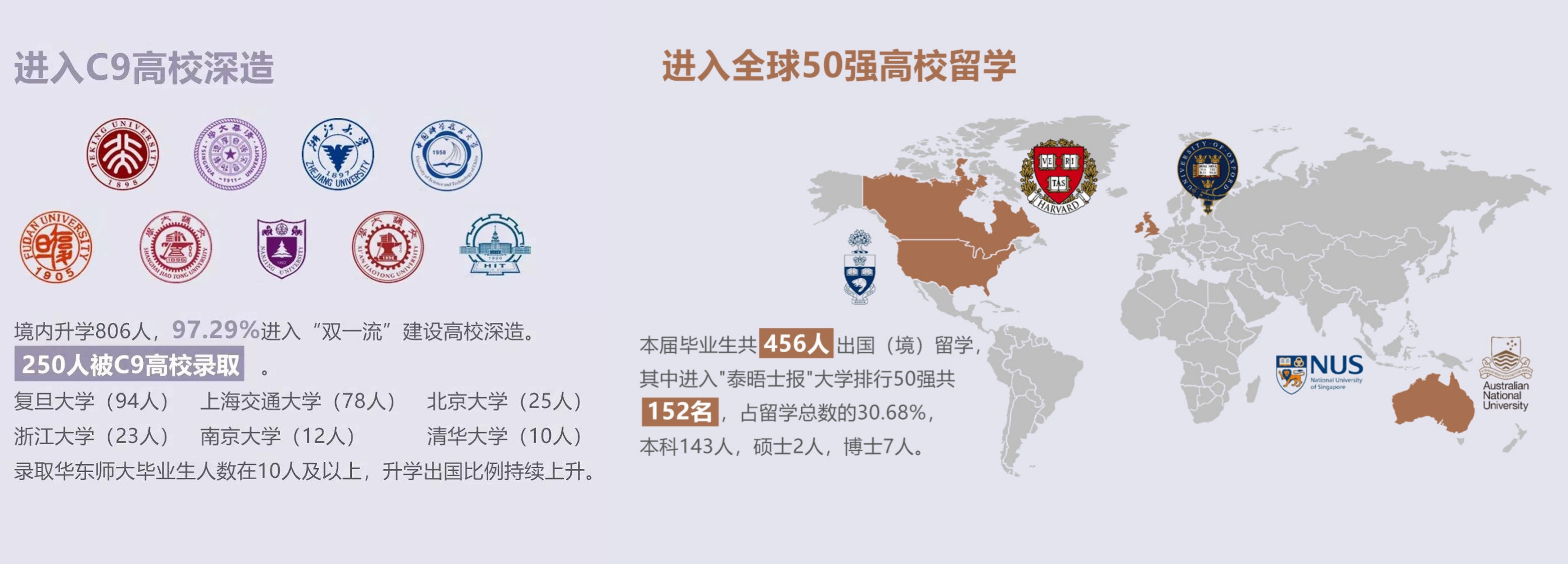毕业生境内升学和出国(境)比例持续上升,24个院系中有14个院系的境内升学和出国(境)比例超过50%。境内升学的毕业生97.29%进入“双一流”建设高校深造,除被本校录取外,共有250人被C9高校录取;出国(境)的毕业生中,进入英国泰晤士报高等教育副刊世界大学排行50强高校的共152名,占留学学生总数的30.68%。
