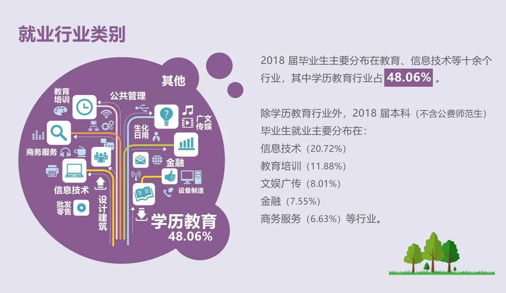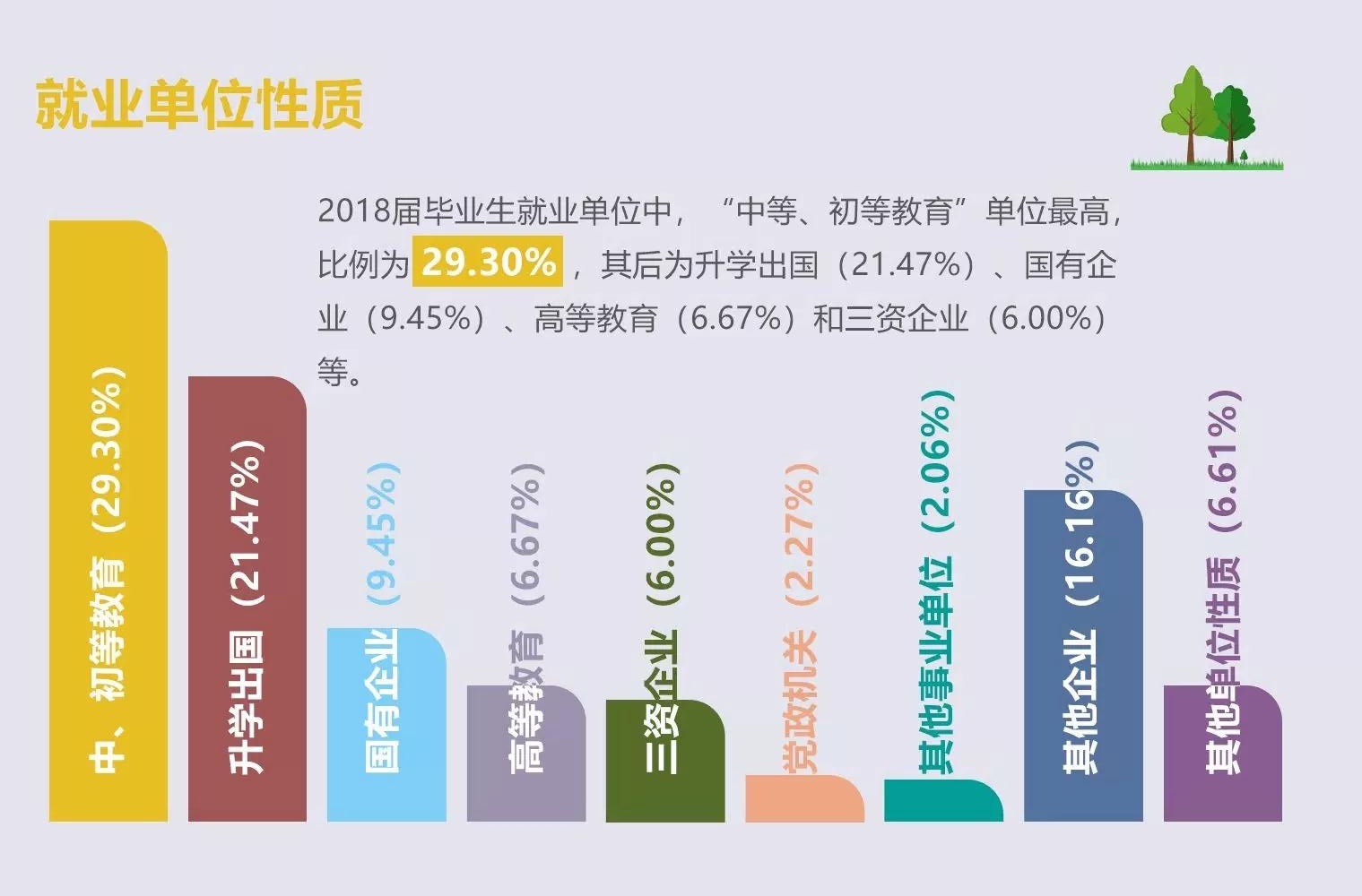 2018届毕业生就业行业分布较广泛,从事教育、信息技术、金融财务等行业的毕业生比例较高。其中,教育行业保持着较强的吸引力,有479名毕业生进入高校工作;毕业生进入世界500强企业的有390人,占企业就职总人数的17.19%,较上届增加111人,有大幅增长;进入党政机关工作的毕业生共163人,进入国有企业工作的毕业生共有678人。