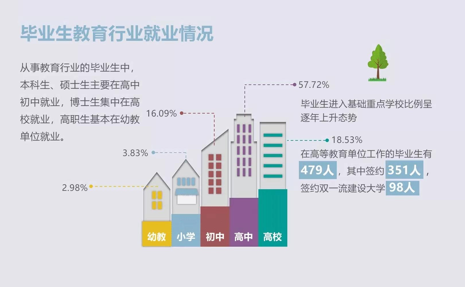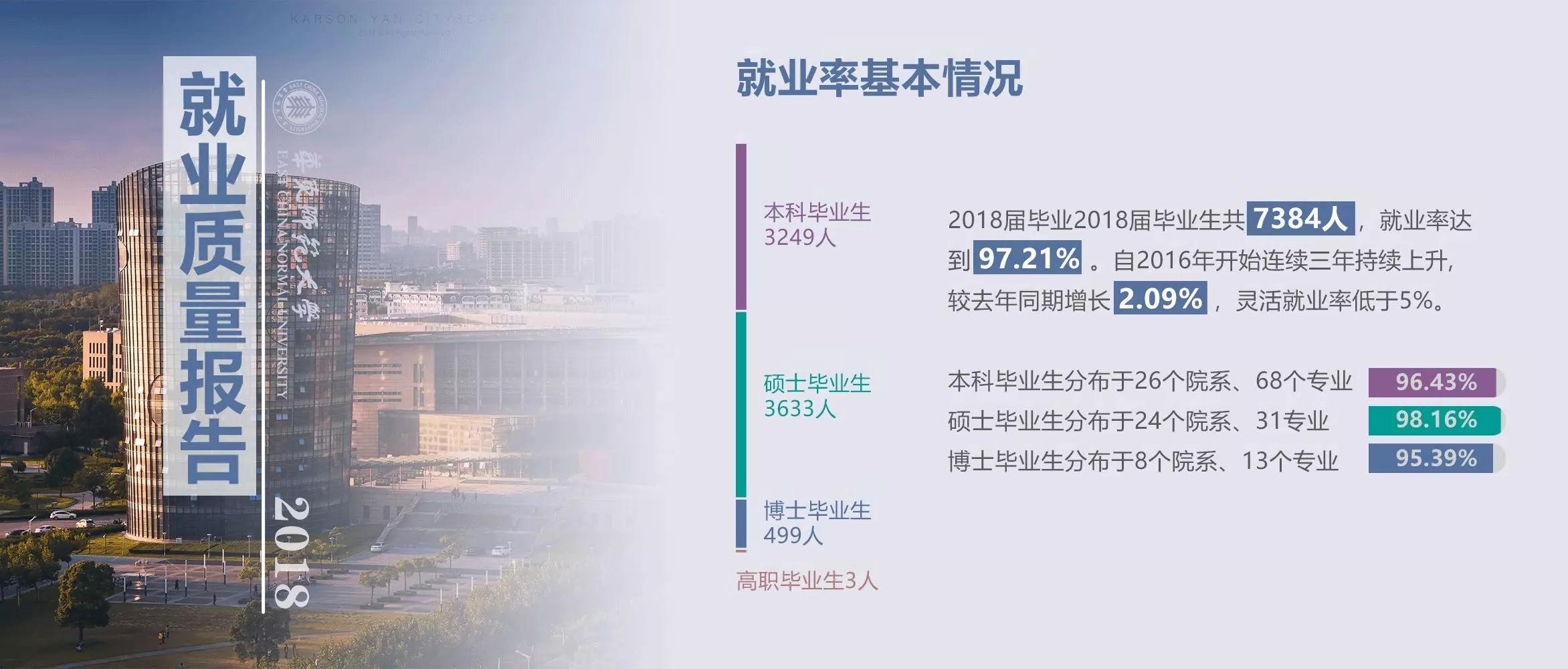 近日,华东师大2018届就业质量报告发布。截止到2018年11月30日,2018年毕业生共7384人,总体就业率为97.21%,连续三年持续上升。报告从就业率、就业去向、单位性质、薪资水平、区域分布、行业分布、市场需求、择业因素、满意程度、工作举措等维度详细分析了华东师范大学2018届毕业生的就业状况。