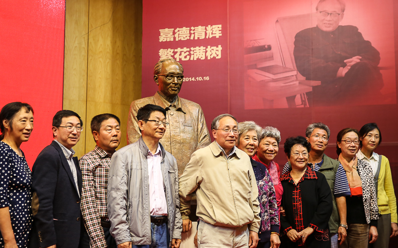 刘作人先生和亲人、朋友们与刘佛年校长铜像合影