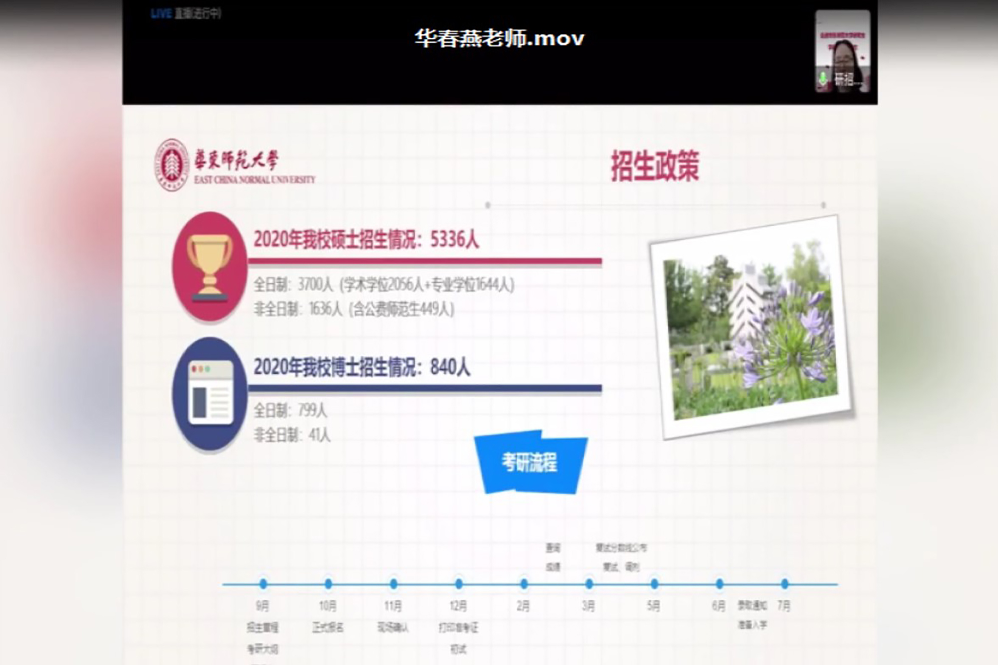 研究生招生办公室主任华春燕以《走进华东师范大学硕士研究生:学科、培养与招生》为题,从华东师大学科概况、研究生培养和资助体系、国境外交流项目、研究生招生政策等方面做了介绍,让广大学子有了更具象化的概念。她提到,华东师大坚持立德树人根本任务,以“服务需求、提高质量、追求卓越”为主线,努力全面办好一流研究生教育,切实推进研究生教育高质量创新发展,目前已有12个学科进入教育部第四轮学科评估A类。