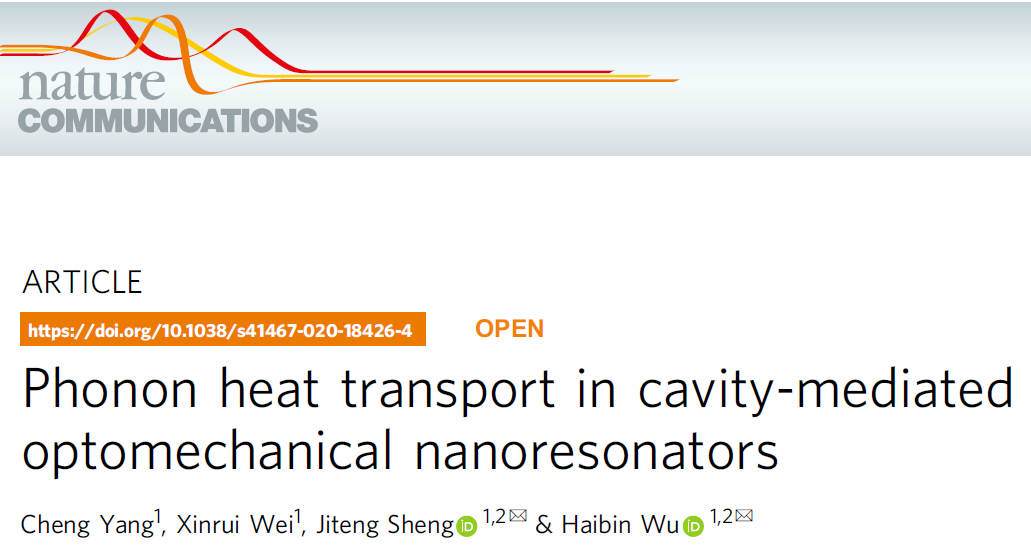 华东师范大学精密光谱科学与技术国家重点实验室武海斌教授带领的研究团队实现了新的热传递方式,热能可以利用光场长距离传输,发现非平衡稳态下可违背热力学第二定律,向全光可控器件、量子热机和能源的有效利用迈出重要一步。该成果以“Phonon heat transport in cavity-mediated optomechanical nanoresonators”为题于2020年9月16日发表在Nature Communications上。华东师范大学为论文的完成单位。博士研究生杨成为该工作第一作者,紫江青年盛继腾研究员和武海斌教授为论文的通讯作者。