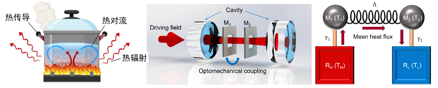 热传递一共有热传导、热对流、热辐射三种方式。这都是宏观意义上的热传递,主要是通过不同的温度来实现流体原子或分子的移动转移。但是当系统的尺寸减小到微米和纳米量级时,随机和量子波动将引入新奇的现象。该研究团队基于光场耦合的长距离纳米振子系统实现了一种区别于传统热传递机制的新型长程可控热传输,观察到热流呈现振荡现象。基于非平衡热力学理论研究了热流的概率密度函数,验证了热力学不确定关系,这种普适关系对未来的小规模器件可能非常重要。