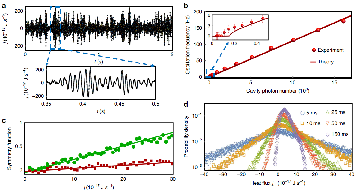 (a) 振荡的瞬时热流;(b)热流振荡频率与光场大小的关系;(c)不同耦合强度下的对称函数;(d)不同积分时间下热流的概率密度函数