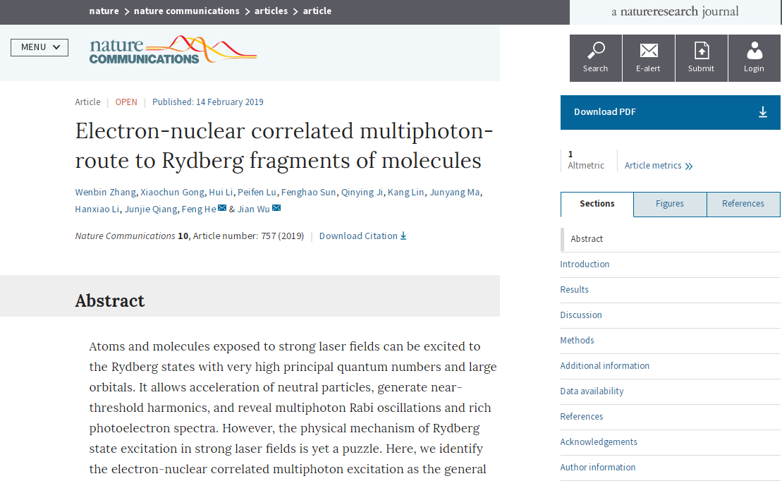近期,精密光谱科学与技术国家重点实验室吴健教授团队在超快激光诱导里德堡态激发研究领域取得重要进展。该团队利用飞秒强激光与分子相互作用产生里德堡原子,并结合电子-原子核关联能谱技术,揭示了多光子共振激发是强激光诱导里德堡态产生的普适机制。研究结果以“Electron-nuclear correlated multiphoton-route to Rydberg fragments of molecules”为题,2019年2月发表在 《自然通讯》(Nature Communications)。该工作与上海交通大学何峰研究员合作完成,华东师范大学为第一完成单位,精密光谱科学与技术国家重点实验室的博士研究生张文斌为论文的第一作者,我校吴健教授和上海交通大学的何峰研究员是论文的共同通讯作者。