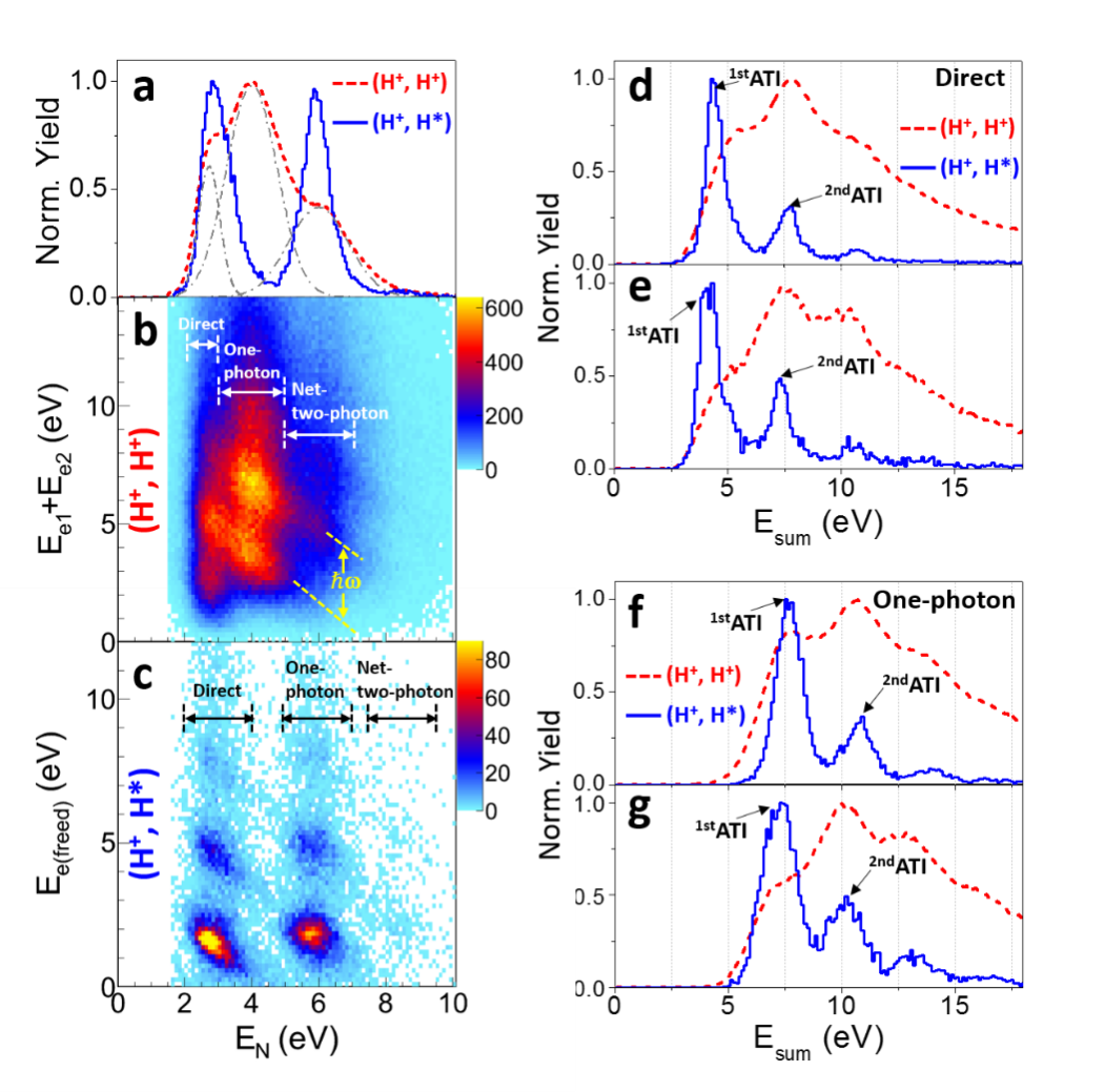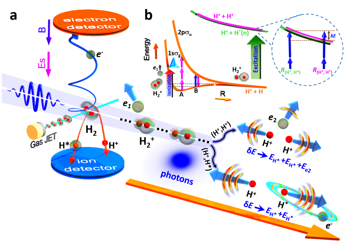 氢气分子(H2)作为最简单的两电子中性分子系统,在揭示分子基本动力学过程方面扮演了十分重要的角色。基于此前发展的中性里德堡原子探测技术,吴健教授团队提出利用紫外飞秒强激光脉冲与氢气分子相互作用,开展强激光诱导里德堡态激发过程的实验探索。通过符合探测光电离解离产生的离子H+、中性里德堡原子H*和自由电子,并结合电子-原子核关联能谱技术,实验揭示了多光子共振激发为强激光诱导里德堡态产生的普适机制。