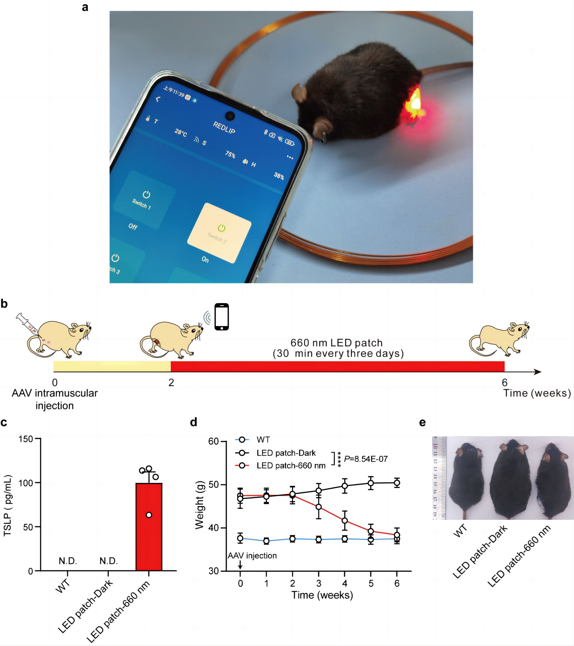 最后,研究人员将光遗传学和电子工程学相结合,设计了一款能够通过智能手机ECNU-TeleMed app控制的红光LED贴片,LED贴片可以很好地解决自然光干扰系统泄露表达的问题,实验证明每3天只需要光照半个小时即可实现显著体重下降,达到光照减肥的效果(图3)。