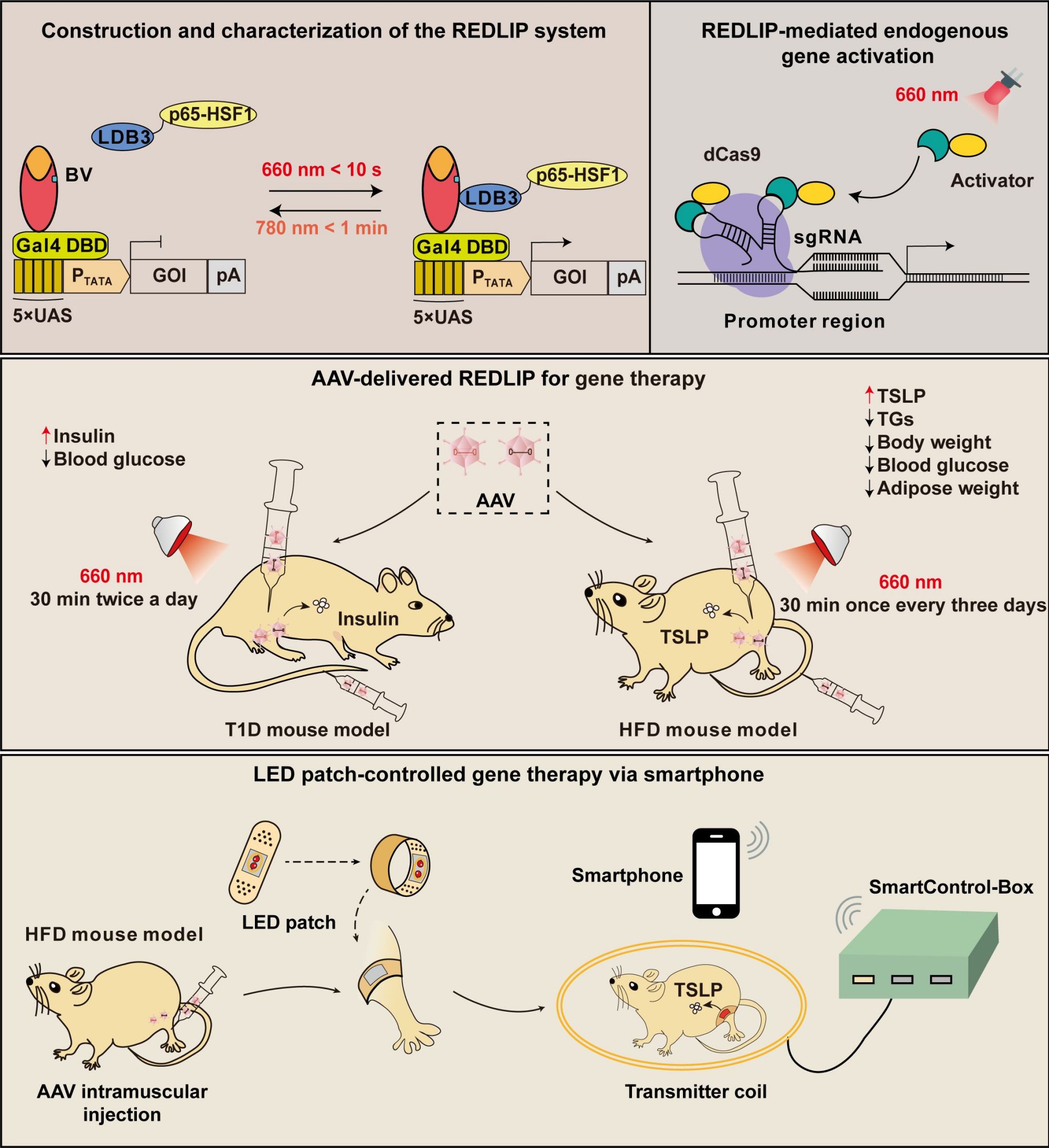 作为概念验证,研究人员利用AAV基因治疗载体递送REDLIP系统到代谢疾病小鼠的肌肉、肝脏组织,成功实现了光控胰岛素、减肥治疗蛋白TSLP的表达,从而有效降低了1型糖尿病模型小鼠的血糖水平和减轻了肥胖模型小鼠的体重。