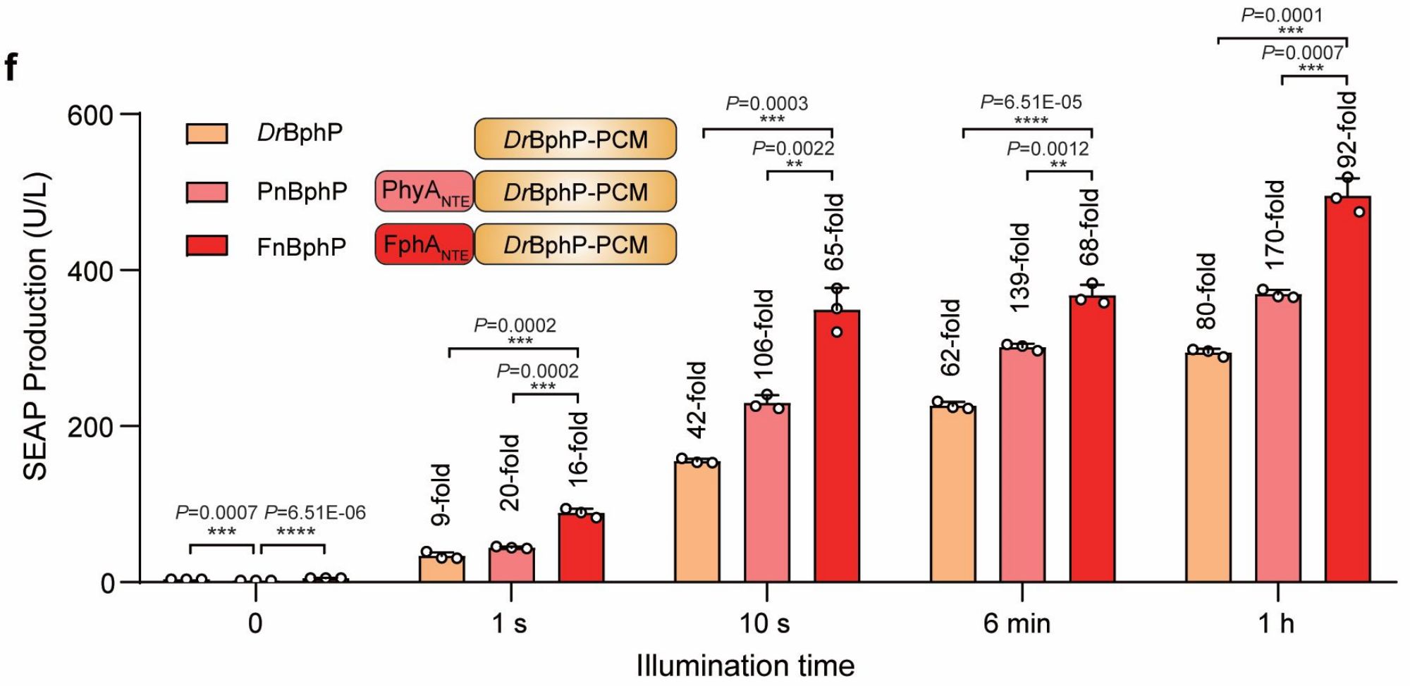 研究人员对不同模块进行优化和测试,发现Fn-REDLIP系统具有较高的激活能力,Pn-REDLIP系统具有较底的本底泄露(图2)。紧接着研究人员对REDLIP系统进行动力学表征。研究结果显示,REDLIP系统具有良好的光谱特异性,光照强度、光照时间、以及高度的可逆性和时空特异性。该系统具有超高的灵敏度,只需要10秒钟的红光照射,即可实现100倍左右的基因诱导表达效果。