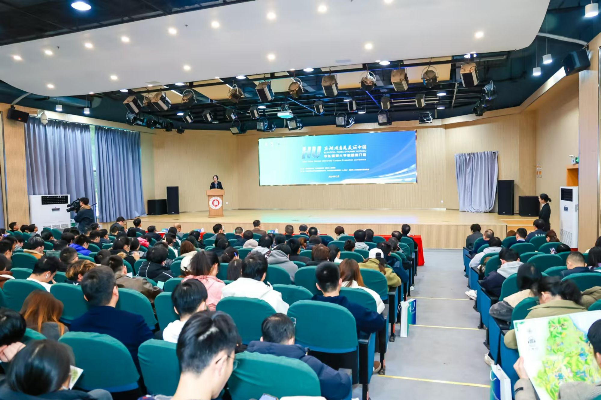 12月18日,“在湖州看见美丽中国”校园推介会在华东师范大学普陀校区大学生活动中心举行。湖州市政协主席李上葵、市政协副主席施会龙,市委组织部副部长、市人力资源和社会保障局党组书记、局长徐晓惠,市教育局党委书记、局长陈建良以及湖州各单位、区县人社局的主要负责人到校宣讲。华东师范大学党委常委、副校长程静,党委学生(研究生)工作部部长赵健,以及基础教育与终身教育发展部、学生职业发展中心、教育学部、外语学院、心理与认知科学学院、数据科学学院相关负责人参加活动。
