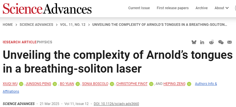 相关成果于2025年3月21日以“Unveiling the complexity of Arnold's tongues in a breathing-soliton laser”为题发表在 Science Advances 上。博士后吴修齐为论文第一作者,彭俊松研究员和曾和平教授为共同通讯作者。博士研究生袁博、英国阿斯顿大学的波斯卡罗博士以及法国勃艮第大学的菲诺特教授为共同作者。该研究得到了国家自然科学基金委、科技部、上海市科委、重庆市科委和中国博士后科学基金的资助。