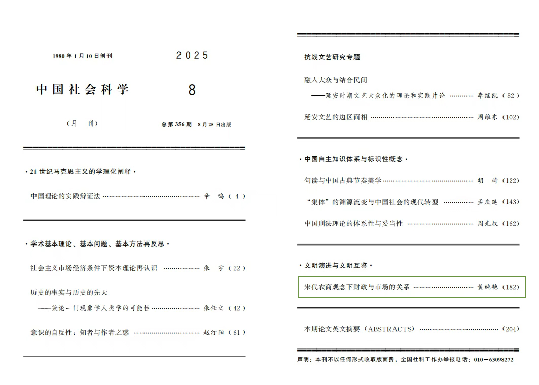华东师范大学历史学系教授黄纯艳《宋代农商观念下财政与市场的关系》一文刊登在《中国社会科学》2025年第8期。