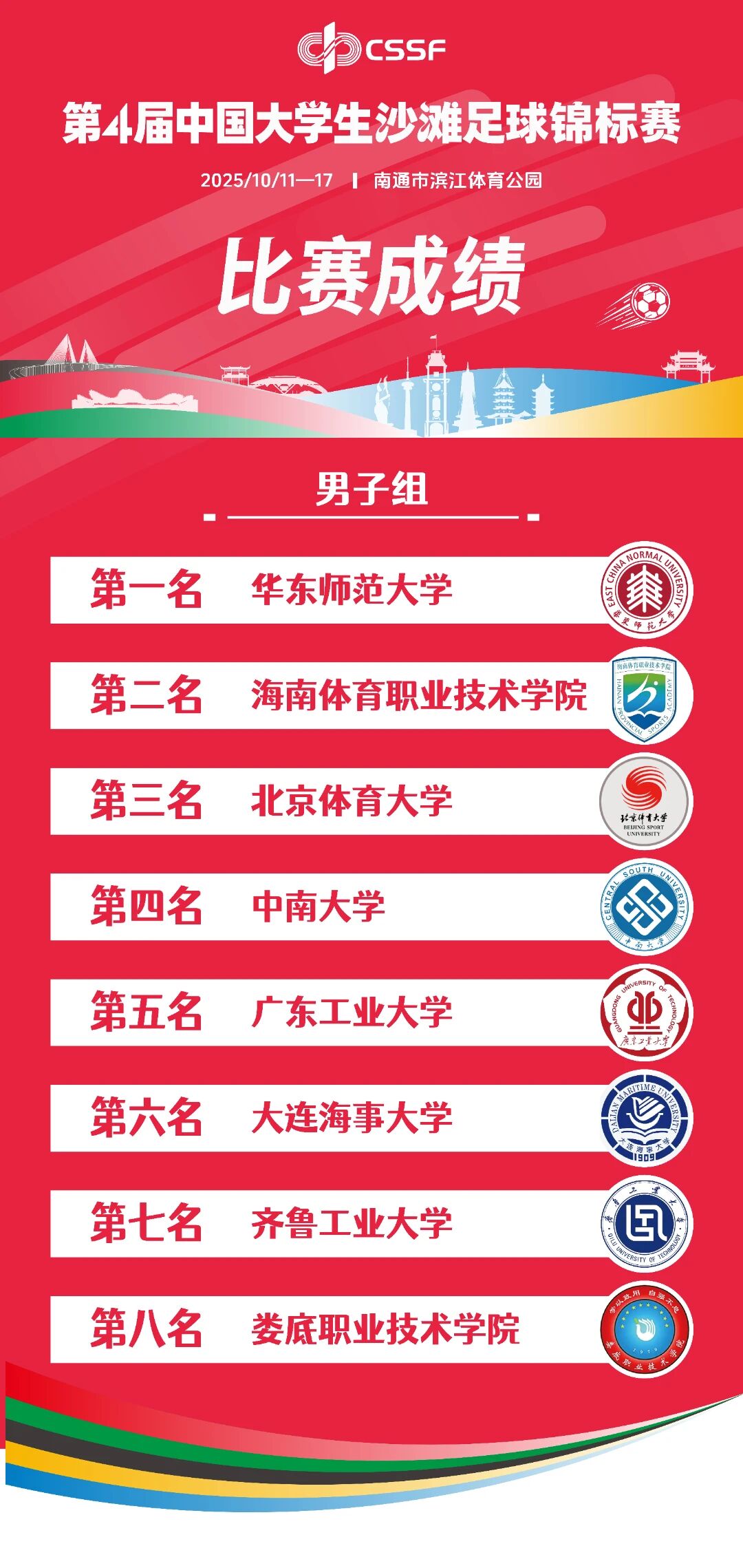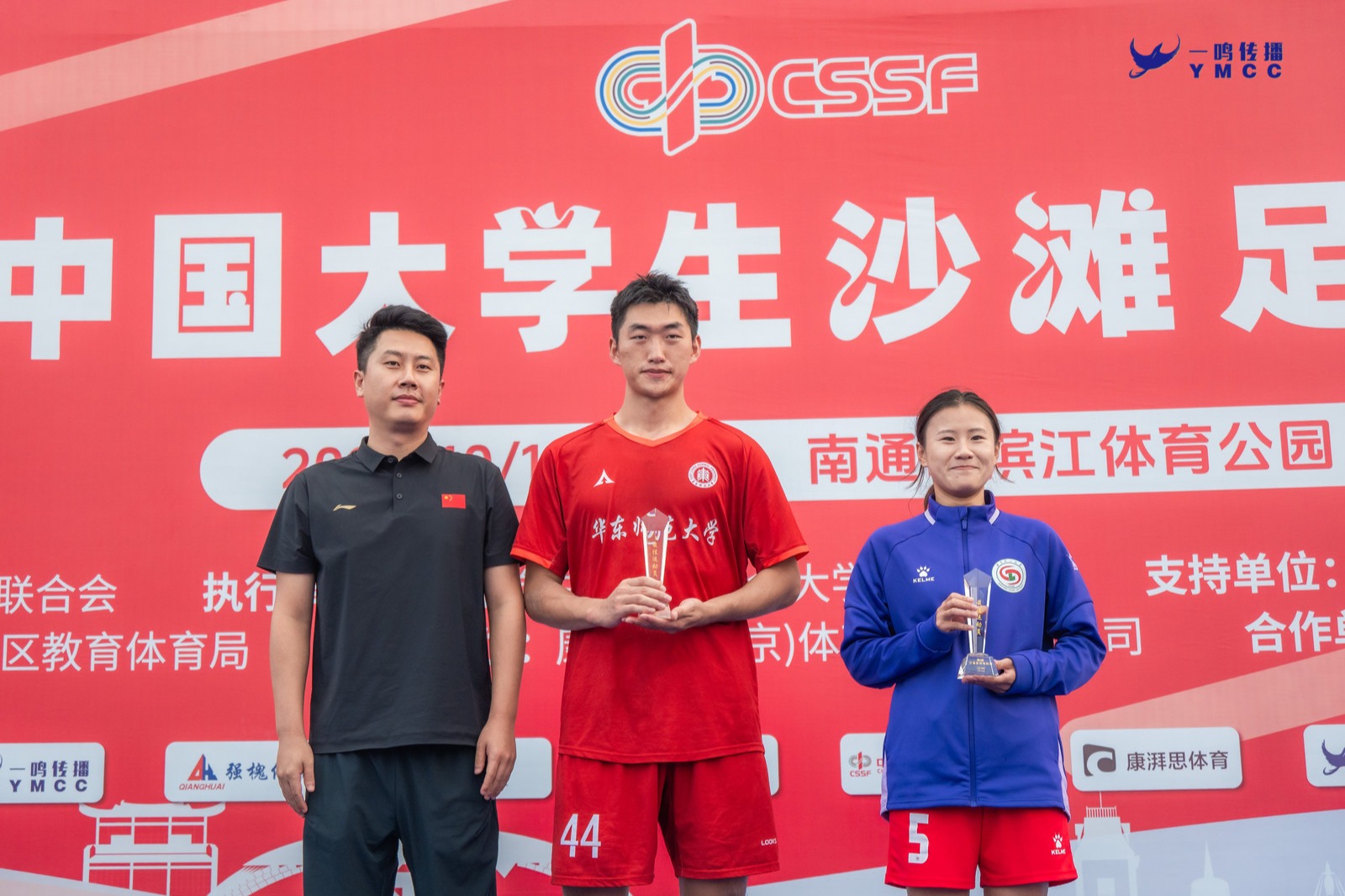10月11日至17日,由中国学生体育联合会主办的第4届中国大学生沙滩足球锦标赛在江苏省南通市滨江体育公园举行。华东师范大学男子足球队在教练员刘宇的带领下,夺得全国总冠军,展现了卓越的团队实力与顽强拼搏的体育精神。