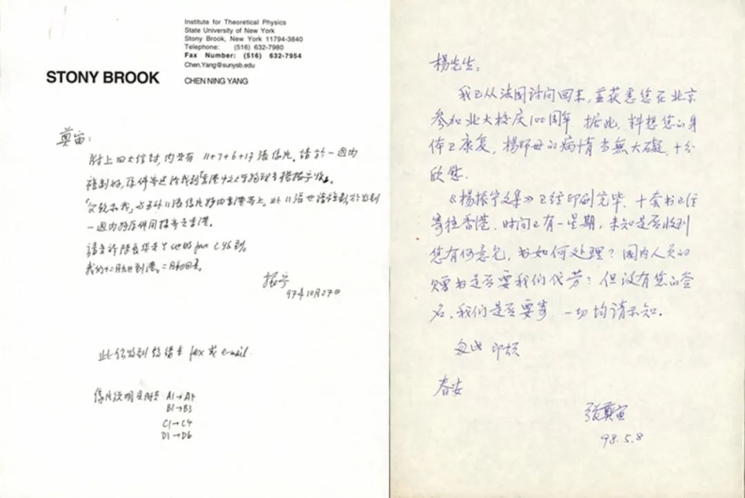 不到两年时间里,传真发出地有香港中文大学、纽约州立大学石溪分校,信中还提及南京、天津、杭州、北京、香港等多地行程安排,可见杨振宁先生在境内外推动学术交往的行迹和活力。这些书信和文集一样,共同构成了珍贵的科学历史资料,也汇集了杨先生重要的社会人生感悟。