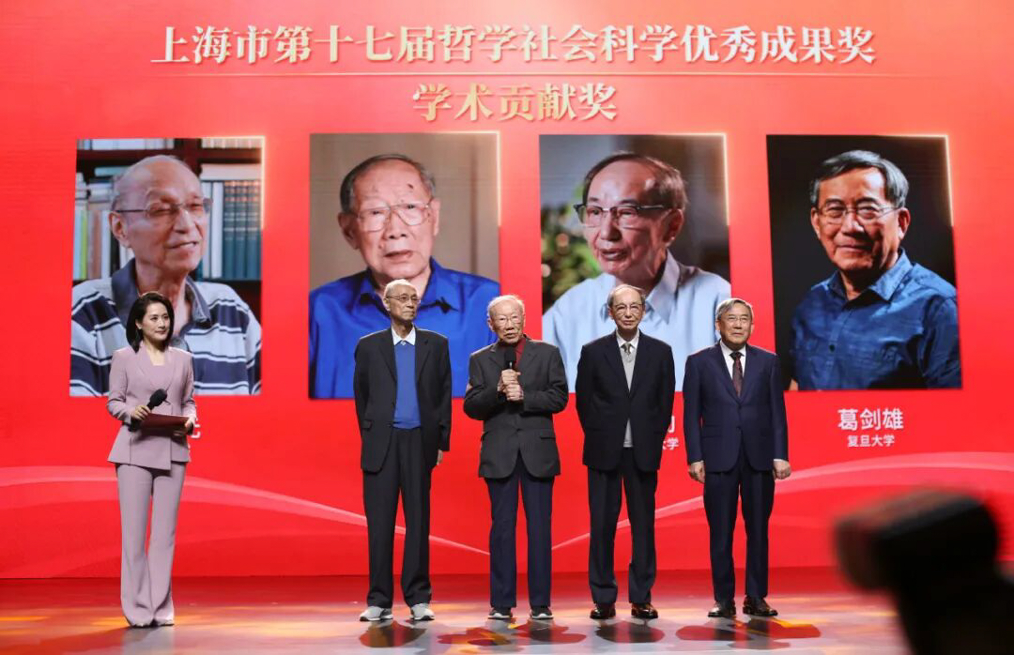 全市四位“学术贡献奖”获得者 ,华东师大刘君德教授、桂世勋教授获奖,市委常委、宣传部部长赵嘉鸣颁奖