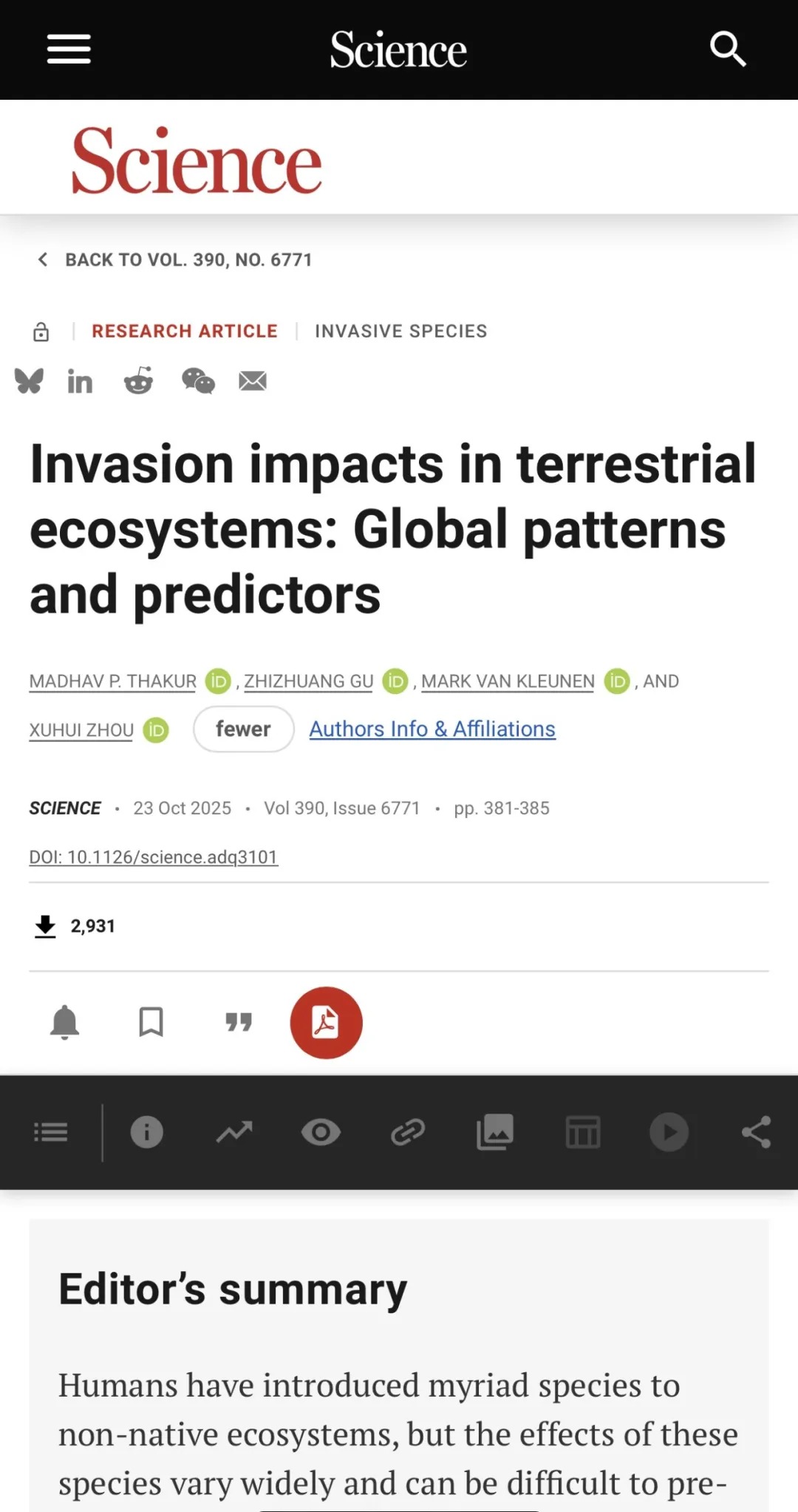 10月23日,华东师范大学博士生顾志以共同第一作者身份在顶刊《科学》(Science)发表最新研究成果,首次在全球尺度上系统量化生物入侵对陆地生态系统的综合影响及动态演变规律。