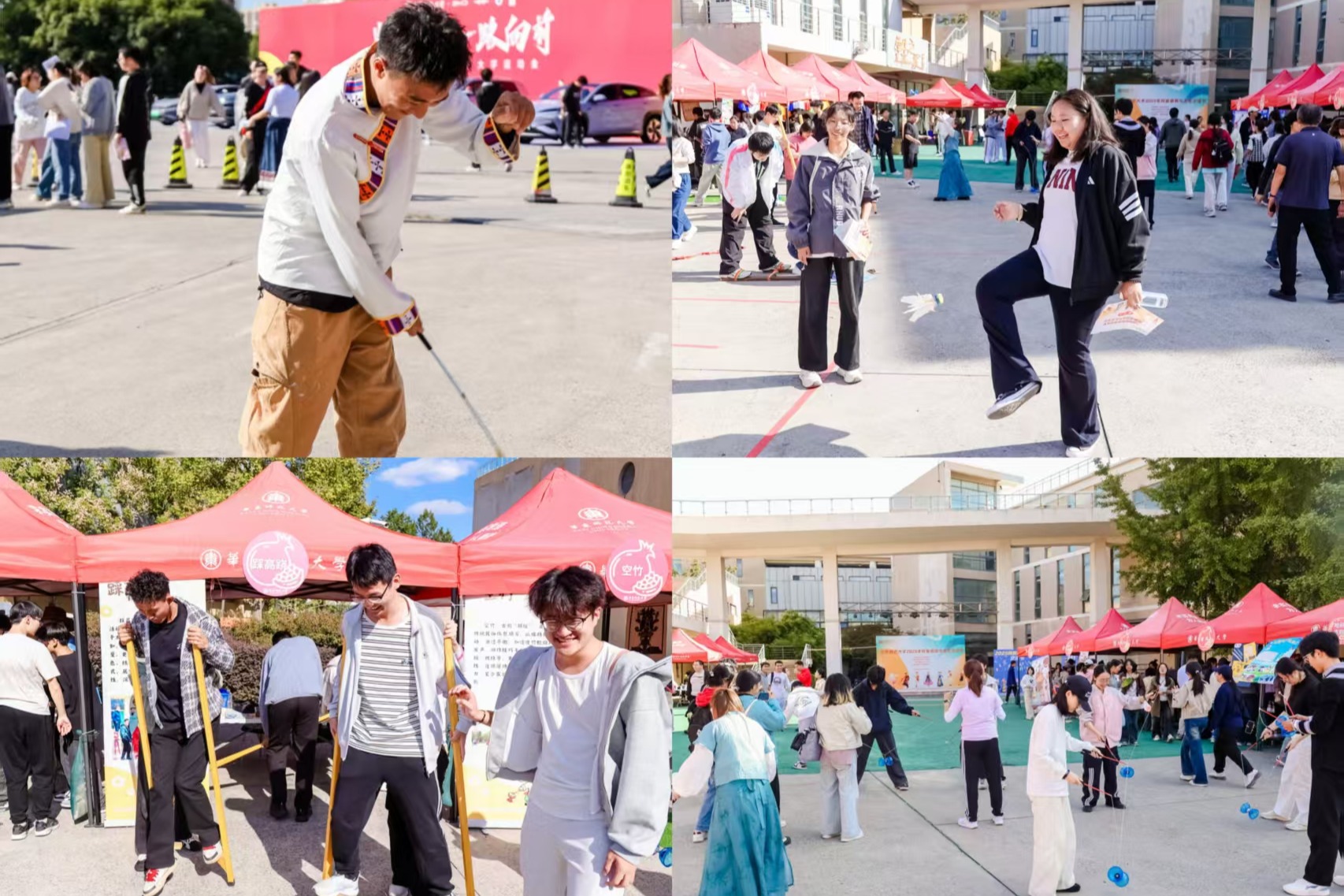 体育项目体验区设有打陀螺、踩高跷、空竹、踢毽子等传统体育项目。师生们在互动竞技中感受传统体育的乐趣,体悟中华文化的博大精深。