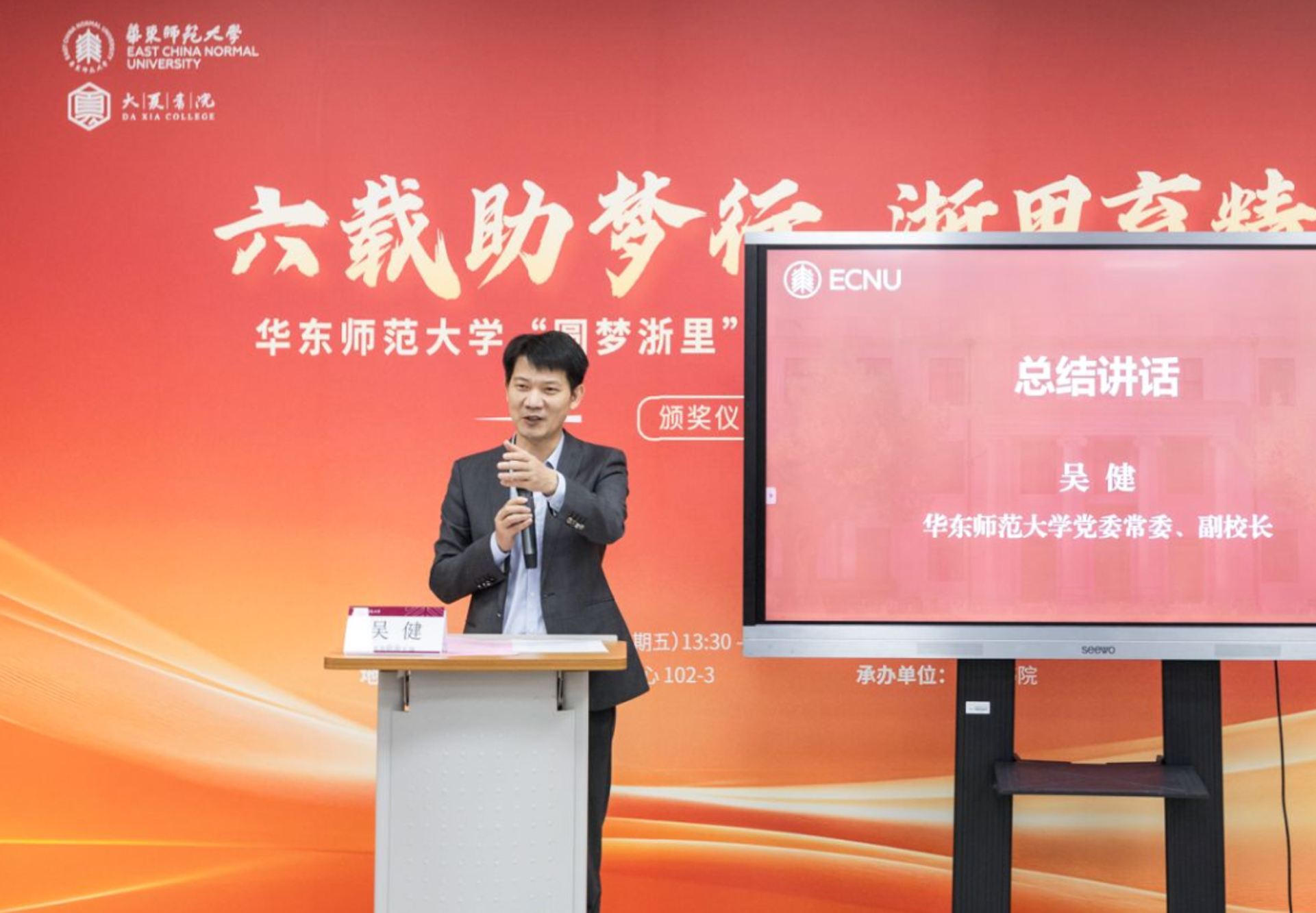 11月7日下午,“六载助梦行,浙里育精英”华东师范大学“圆梦浙里”奖学金颁奖仪式暨校友面对面活动在普陀校区大学生活动中心举办。作为华东师范大学浙江籍校友捐资设立,助力母校人才培养的品牌项目,“圆梦浙里”奖学金在党委学生(研究生)工作部(处)、校友会的指导下,由大夏书院、各学部、院系共同组织评选,从2019年设立以来至今已实施六年,先后资助了36位优秀在校学生,用以激励师大学子坚守初心、接续奋斗、筑梦人生,为实现中华民族伟大复兴贡献力量。
