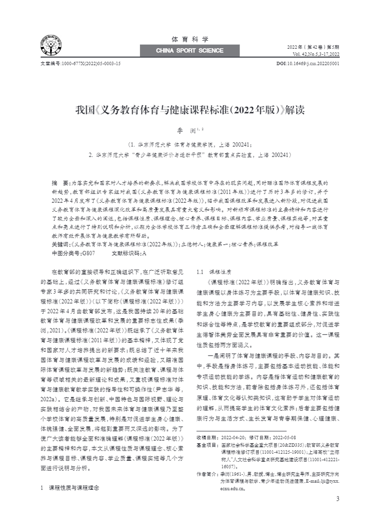 简 介:该成果是我国首篇全面精准解读《义务教育体育与健康课程标准(2022年版)》的论文,主要对新颁布的课程标准的主要精神和内容进行了较为全面和深入的阐述,包括课程性质、课程理念、核心素养、课程目标、课程内容、学业质量、课程实施等,对其重点和亮点进行了特别说明和分析,以期为全体学校体育工作者正确和全面理解课程标准提供参考,对指导一线体育教师有效开展体育与健康教学有所帮助。此外,本成果所提出的系统性教学建议与评价建议,对丰富体育与健康课程理论体系、开创全新教学实践具有深远影响,为当前和未来我国体育与健康课程的科学有效实践提供了指导路径,对促进学生身心健康、体魄强健、全面发展具有重要的现实意义。