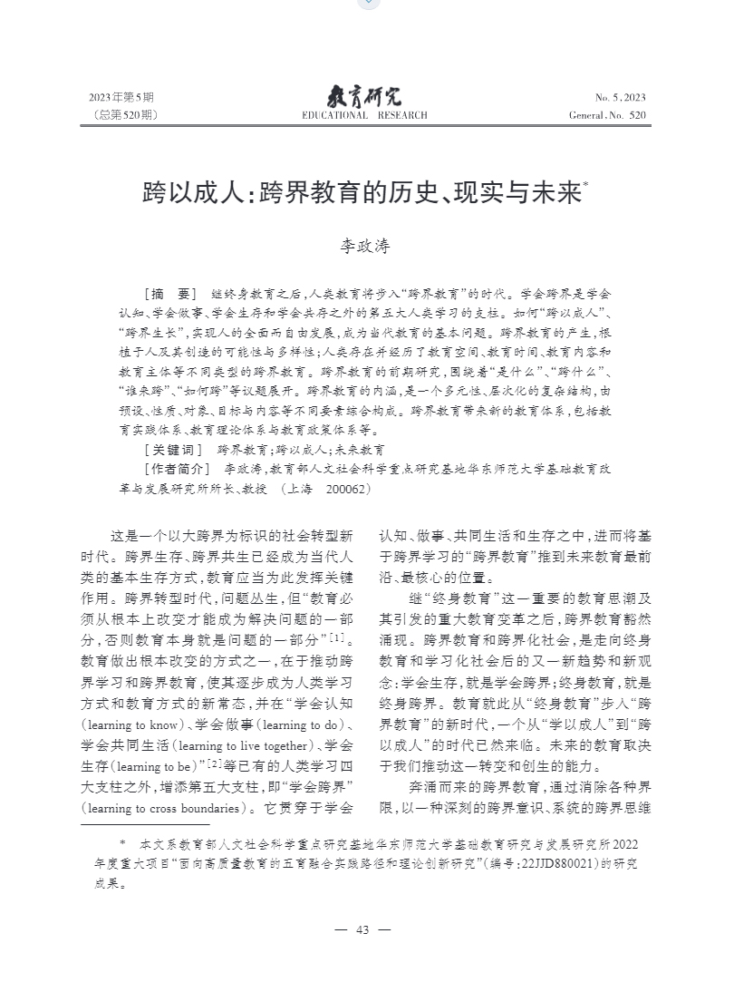 简 介:《跨以成人:跨界教育的历史、现实与未来》一文作者系华东师范大学基教所所长李政涛教授,刊于《教育研究》杂志2023年第5期。本文提出,继终身教育之后,人类教育将步入“跨界教育”的时代。学会跨界是学会认知、学会做事、学会生存和学会共存之外的第五大人类学习的支柱。如何“跨以成人”“跨界生长”,实现人的全面而自由发展,成为当代教育的基本问题。跨界教育的产生,根植于人及其创造的可能性与多样性;人类存在并经历了教育空间、教育时间、教育内容和教育主体等不同类型的跨界教育。跨界教育的前期研究,围绕着“是什么”“跨什么”“谁来跨”“如何跨”等议题展开。跨界教育的内涵,是一个多元性、层次化的复杂结构,由预设、性质、对象、目标与内容等不同要素综合构成。跨界教育带来新的教育体系,包括教育实践体系、教育理论体系与教育政策体系等。