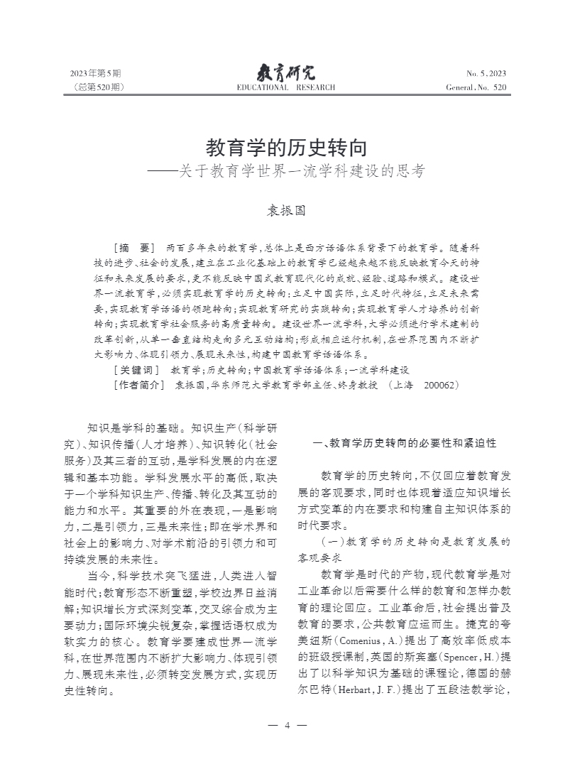 简 介:《教育学的历史转向——关于教育学世界一流学科建设的思考》一文作者系华东师范大学教育学部主任袁振国教授,刊于2023年第5期《教育研究》杂志。本文提出,两百多年来的教育学,总体上是西方话语体系背景下的教育学。随着科技的进步、社会的发展,建立在工业化基础上的教育学已经越来越不能反映教育今天的特征和未来发展的要求,更不能反映中国式教育现代化的成就、经验、道路和模式。建设世界一流教育学,必须实现教育学的历史转向:立足中国实际,立足时代特征,立足未来需要,实现教育学话语的领跑转向;实现教育研究的实践转向;实现教育学人才培养的创新转向;实现教育学社会服务的高质量转向。建设世界一流学科,大学必须进行学术建制的改革创新,从单一垂直结构走向多元互动结构;形成相应运行机制,在世界范围内不断扩大影响力、体现引领力、展现未来性,构建中国教育学话语体系。