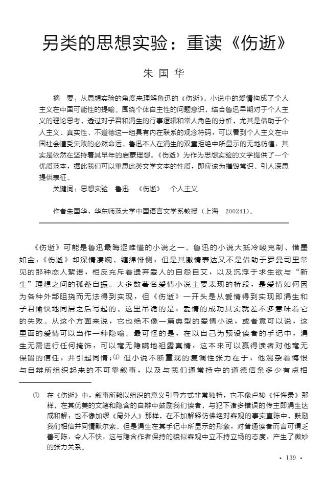 简 介:从思想实验的角度来理解鲁迅的《伤逝》,小说中的爱情构成了个人主义在中国可能性的提喻。围绕个体自主性的问题意识,结合鲁迅早期对于个人主义的理论思考,透过对子君和涓生的行事逻辑和常人角色的分析,尤其是借助于个人主义、真实性、不道德这一组具有内在联系的观念符码,可以看到个人主义在中国社会遭受失败的必然命运。鲁迅本人在涓生的双重拒绝中所显示的无地彷徨,其实是依然在坚持着其早年的启蒙理想。《伤逝》为作为思想实验的文学提供了一个优质范本,据此我们可以重思此类文学文本的性质,即应该为摧毁常识、引人深思提供表征。