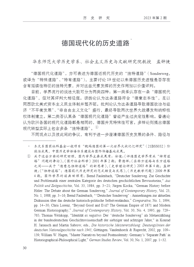 简 介:该成果旨在深入剖析德国自19世纪以来所走的现代化道路,即所谓的“独特道路”(Sonderweg),并论证其并非终结于1945年,而是其影响一直延续至当代。文章驳斥了将“特殊性”与“普遍性”简单对立的传统观点,提出应以一种辩证的“纠缠态”视角来理解德国现代化的复杂本质,并从中提炼出五个核心特征。首先,德国现代化在一个“不确定的”地理空间中孕育发展。这种空间上的不稳定性困扰着德意志民族国家的内部认同建构,并使其外部交往策略在“德国中的欧洲”霸权想象与“欧洲中的德国”现实融入之间反复摇摆。其次,作为后现代化国家,德国呈现出强烈的“不同时代的同时代性”特征,一方面延缓了政治革命与公民成熟,另一方面却催生了如社会保险制度、“社会市场经济”等结合传统与国家干预的创新模式。第三,面对复杂局面,德国社会演化出“强人期待”与“妥协实践”并行的双重心理与实践机制。第四,战争是形塑德国现代化道路的关键动力。它既推动了民族国家建构,也暴露了军国主义与扩张逻辑的巨大祸患,其记忆与反思至今仍深刻影响着德国的政治文化。第五,德国现代化道路的本质是“特殊性”与“普遍性”的“纠缠态”。这两种特质并非彼此排斥,而是相互交织、互为支撑,共同构成了理解德国近现代历史进程的钥匙。