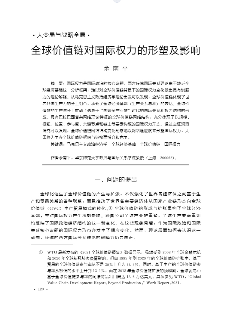 简 介:该成果认为,国际权力是国际政治的核心议题,但西方传统国际关系理论由于缺乏全球经济基础这一分析框架,难以对全球价值链背景下的国际权力变化做出具有说服力的理论解释。从马克思主义政治经济学理论出发可以发现,全球价值链体现了世界各国生产力的分工组合,承载了全球经济基础(生产关系总和)的表达。全球价值链的生产与分工推动了迥异于“国家全产业链”时代的国际关系和权力结构的形成。具有巴拉巴西复杂网络理论特征的全球价值链网络结构,充分体现了以规模、枢纽、位置、参与度、关键节点和链主等要素构成的国际权力形态。通过实证观察研究可以发现,全球价值链网络结构变化动态地以网络适应度来形塑国际权力,大国将为争夺全球价值链枢纽与链接而博弈和竞争。