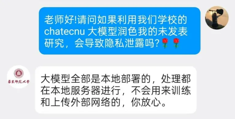 特别关注数据安全的你,上述问题是否也曾让你犹豫使用大模型。未发表的论文会不会被泄露?研发中的技术能否得到保护?其他模型是否会“偷学”在研学术成果?使用ChatECNU,以上问题无需担心——全流程本地化部署,数据不出校园;不存储、不使用未发表内容训练其他模型;隐私安全有保障,对话内容仅你可见。