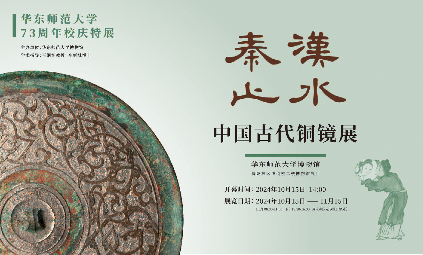 “秦汉止水:中国古代铜镜展”,于2024年10月15日至11月16日在华东师大博物馆展出,是讲好中国古代铜镜故事,弘扬中华优秀传统文化的生动体现。展览展出了先秦至秦汉时期的100面中国古代珍贵铜镜,以“明镜鉴形”“方圆殊趣”“飞龙在天”“巧刻文章”4个单元为切入点,展示铜镜背面装饰由简单的几何纹、动物纹到铭文的演变,弦纹钮、圆钮、连峰钮等的微妙区别,并邀请铜镜研究专家、收藏家王纲怀先生等做现场导览和讲解。