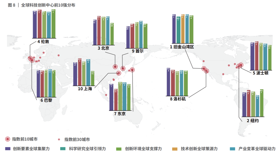 综合评估显示,2025年全球科技创新中心前30强依次为:旧金山湾区、纽约、北京、伦敦、波士顿、巴黎、东京、洛杉矶、首尔、上海、芝加哥、慕尼黑、西雅图、华盛顿、深圳、新加坡、斯德哥尔摩、杭州、奥斯汀、休斯敦、费城、多伦多、阿姆斯特丹、圣迭戈、剑桥、大阪、巴塞尔、香港、柏林、苏黎世。