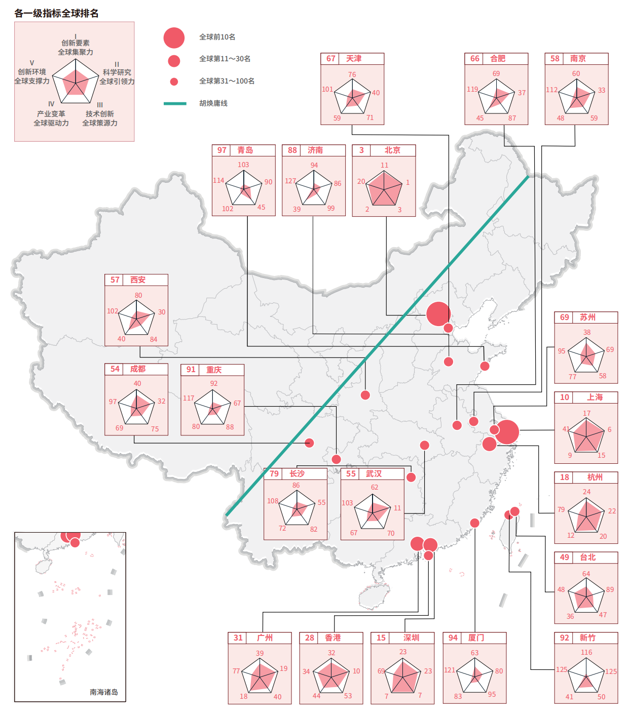 其三,进入全球百强的20个中国城市,全部位于胡焕庸线以东。其中,胡焕庸线东南侧的京津冀、长三角、粤港澳大湾区三大都市圈集聚了半数(10个)百强科创中心,且中国进入全球前30强的城市全部位于此三大都市圈,这在短期内仍将是中国创新发展的主要空间形态。具体来看,京津冀的北京和天津2个城市进入全球100强,分别为北京(第3位)和天津(第67位)。长三角城市群中有上海(第10位)、杭州(第18位)、南京(第58位)、合肥(第66位)和苏州(第69位)五个城市进入100强榜单。粤港澳大湾区则有深圳(第15位)、香港(第28位)和广州(第31位)入选。其中,上海在创新要素集聚力从2024年的全球第24位跃升至第17位,科学研究全球引领力维持第6位,创新环境支撑力从第47位进步至第41位,成绩稳健。但是,技术创新策源力从第13位降低至第15位,产业变革控制力从第8位降至第9位,仍面临一定的全球竞争压力。