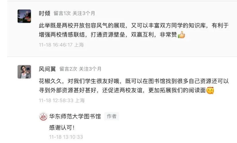 作为一名历史学的学生,看到这个消息可谓非常之开心。无论是课程作业的需要,还是个人阅读兴趣,这次馆际互通互借对我们来说都是福音。我相信,知识互通共享的同时也能促进双方彼此情感的连接,从“爱在华师大”未尝不可以到“爱在花椒”,同学们之间相互学习,共同进步,一起做新时代好青年!