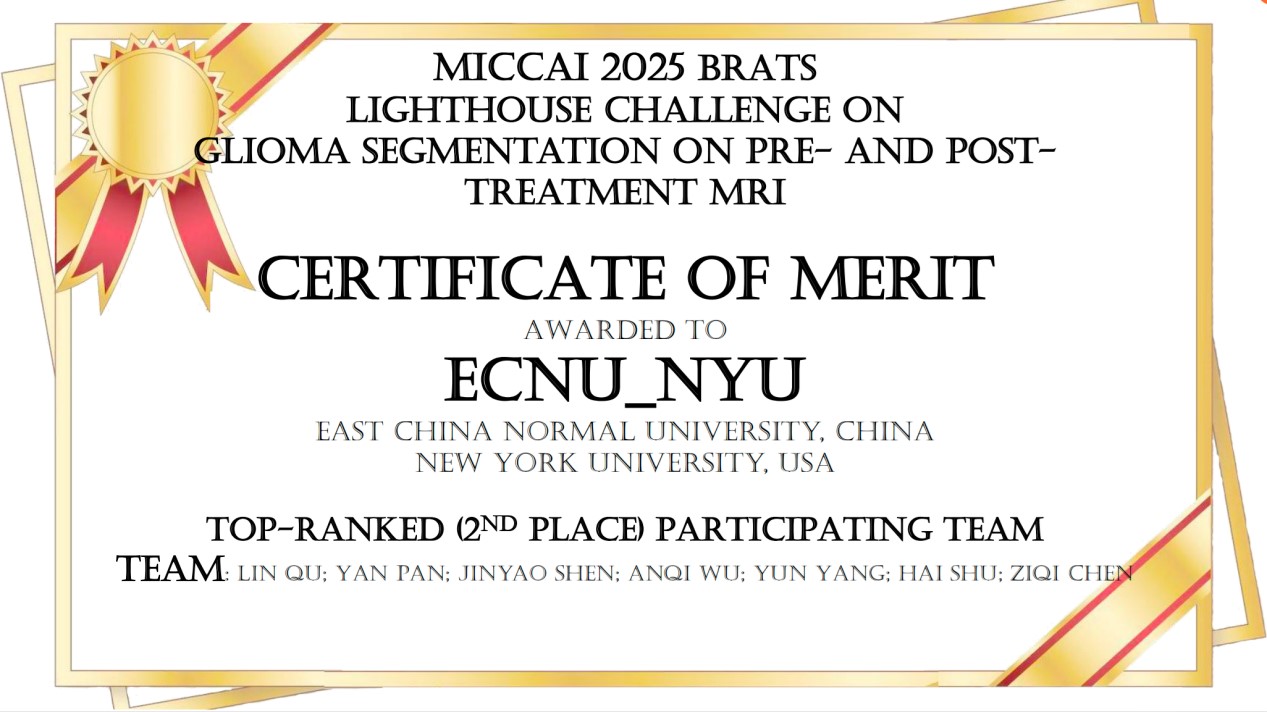 本次参赛的BraTS 2025 Lighthouse Challenge(灯塔挑战),是MICCAI从众多竞赛中遴选出的“高影响力挑战”,强调真实高质量临床数据、严格的盲测评估机制以及与临床需求的紧密对齐,旨在推动具备实际落地潜力的医学人工智能技术发展。