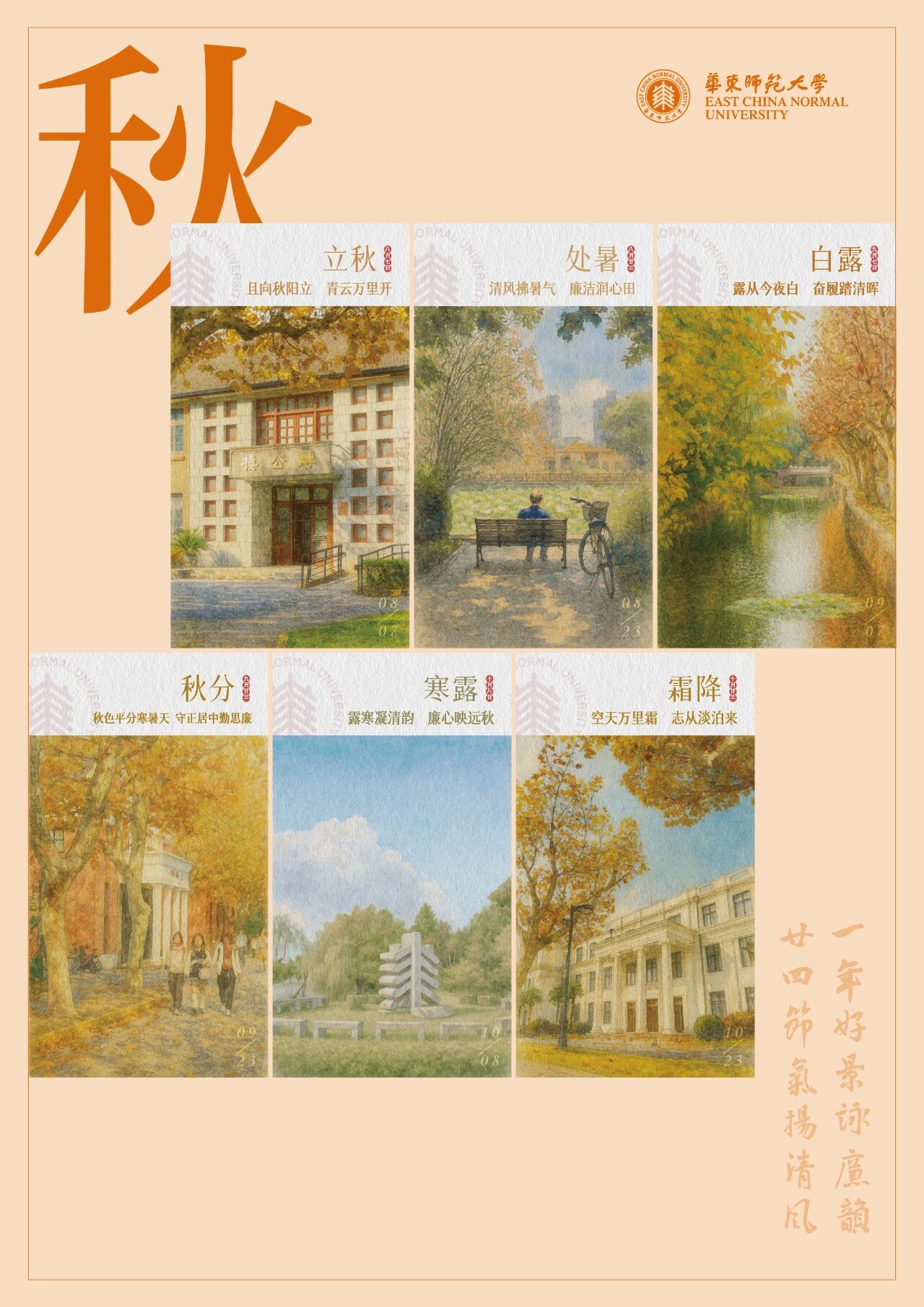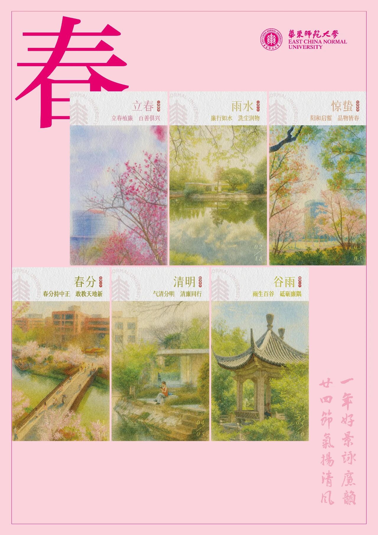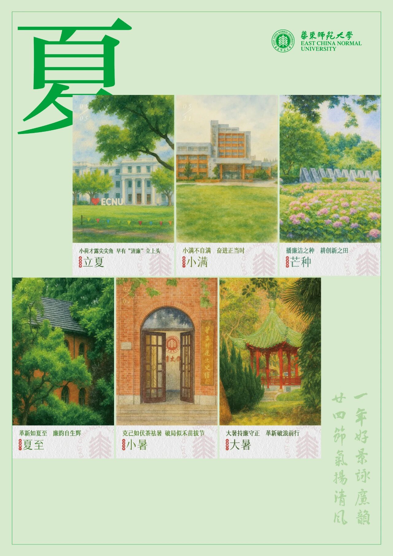 华东师大资产经营有限公司携手美术学院师生创作的《一年好景咏廉韵,廿四节气扬清风》作品入选“绘廉铸魂”创意优秀作品。该作品以二十四节气为时间轴,选取群贤堂、思群堂、丽娃河、夏雨岛、大师石等24处华东师大标志性校园景观,一景一廉语,将传统文化节气与廉洁文化深度融合。节气廉语精心创作,比如“立春植廉,百善俱兴”“春分持中正,敢教天地新”“小满不自满,奋进正当时”“大寒守寸心,清节胜苍穹”等,既有传统文化的诗意表达,又赋予新时代廉洁文化丰富内涵。作品构建起节气、校景、廉语融合的廉洁文化载体,引导师生观景思廉、化风成俗,于潜移默化中营造清正廉洁、锐意改革、团结奋进的育人生态。