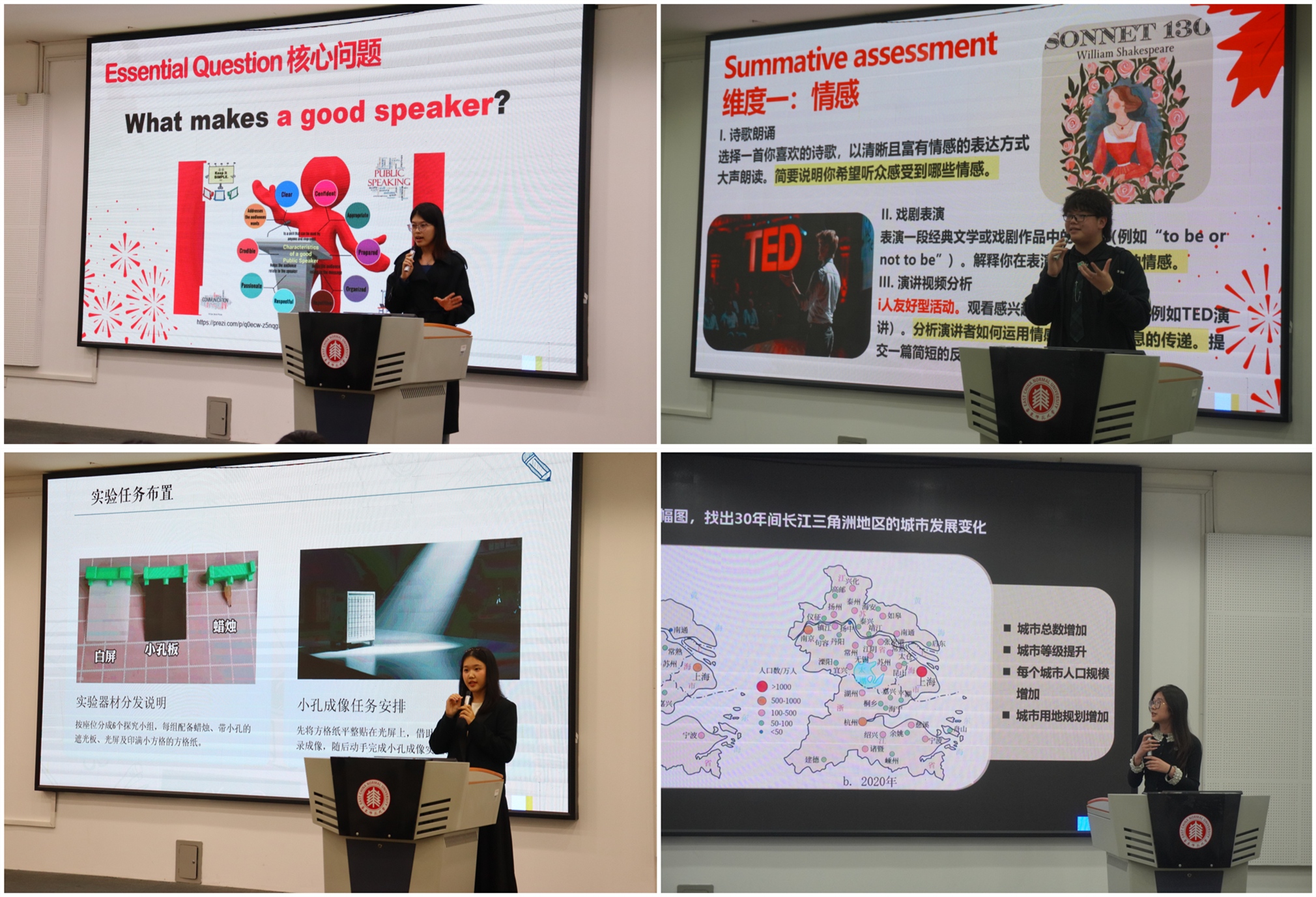课堂展示环节,各学科组师范生立足国内教育实际,融合在加所学的教育理念、教学法开展模拟教学,亮点纷呈。英语组崔元婕、杜瑞、马毅敏依托UbD(追求理解的教学设计)框架,围绕“口语塑造思想、身份与人际关系”开展说课,以分层任务、互动活动助力学生语言能力阶梯式成长;数学组吴妍霏、沈嘉俊、郭沐瑶以“比例与面积——小孔成像中的数学奥秘”为主题进行试讲,采用项目式学习,通过动手实验、数据归纳将抽象定理具象化,实现跨学科融合;地理组楼梦芸、李熙婕、白雨润的试讲紧扣“城镇化”,以上海城市变迁为切入点,用递进式问题链、“六边形联想”探究活动,落地学科核心素养培育。