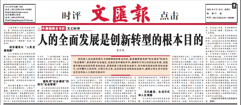 联合国发展署从1990年开始发布《人类发展报告》,以综合了健康、教育和收入三方面指标的“人类发展指数”来衡量国家成就。在2011年的《人类发展报告》中,中国在178个国家和地区中排名101位。在改变这种局面的全国努力当中,“人类发展指数”在内地各地区里排名第一的上海,具备更强的能力,应承担更大的责任。上海的经济水平领先于全国,但经济增速落后于全国,这一方面意味着上海的经济发展成就为人的全面发展提供了较好条件,另一方面意味着上海的经济发展必须通过人的全面发展而获得新的动力。