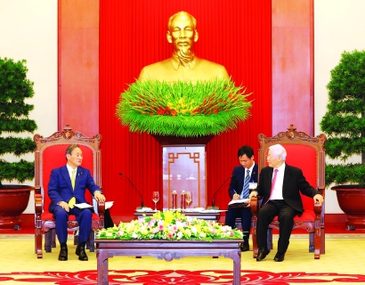 10月19日,在越南首都河内,越共中央总书记、国家主席阮富仲(右一)会见到访的日本首相菅义伟(左一)