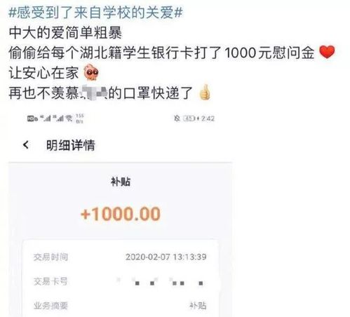 湖南大学为湖北籍研究生发放了800元的抗击肺炎补助;南京大学给湖北籍贫困学子寄去2000元补助,并为线上开课启动了购买手机、补贴流量费等专项资助;四川大学向学生发放疫情补助,其中,疫情防控专项补助向湖北籍家庭经济困难学生按照困难认定等级发放2000元/1000元/600元……