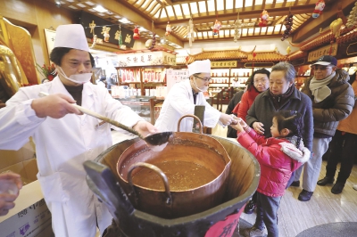 昨天,市民游客来到老城隍庙童涵春堂的腊八粥施粥点,喝上一碗热腾腾的腊八粥,在体验传统文化的同时也感受到了新春的喜庆气氛。袁婧摄