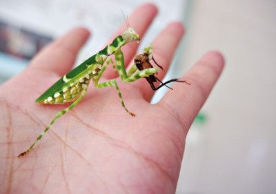 “在生态链中,螳螂处于较高级的位置,因而它们属于‘守株待兔’型,一动不动地等着猎物自投罗网。”何祝清一边把一只螳螂放在自己的手上展示一边说:“一般昆虫都是有六条腿的,但螳螂你只能看到它四条腿,它的两条前肢特化为捕食足,好像人的手一样,专门用来捕捉猎物。”