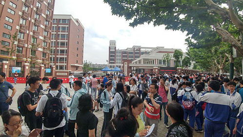上午八点整,曹杨二中考点门口已聚满考生。 澎湃新闻见习记者 杨帆 图