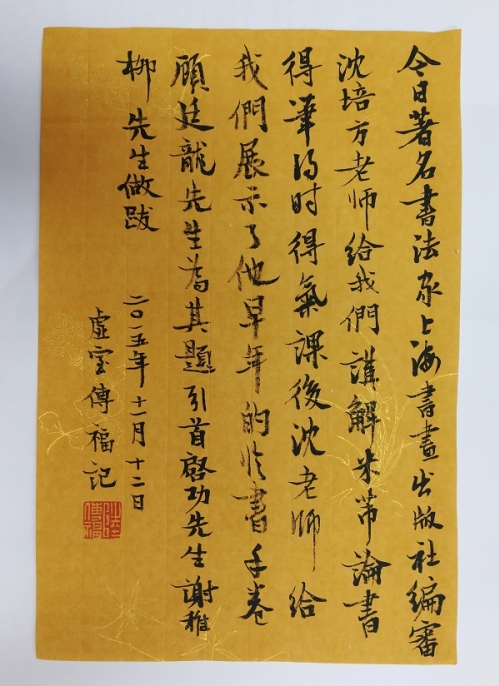 今日,著名书法家,上海书画出版社编审沈培方老师给我们讲解米芾论书:得笔、得时、得气。课后沈老师给我们展示了他早年的临书手卷。顾廷龙先生为其题引首,启功先生,谢稚柳先生做跋。