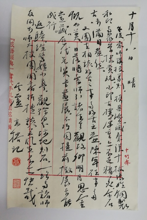 丙申十月二十,辰刻起,过吴杰老师处补习日语,未刻归来,自题宽庐肖像印存,酉刻,子闻兄携螃蟹来宿舍邀陈名兄一同享用,谈未来与理想,亥刻离去,子时临八大信札数件,并以八大笔意书对联一幅。