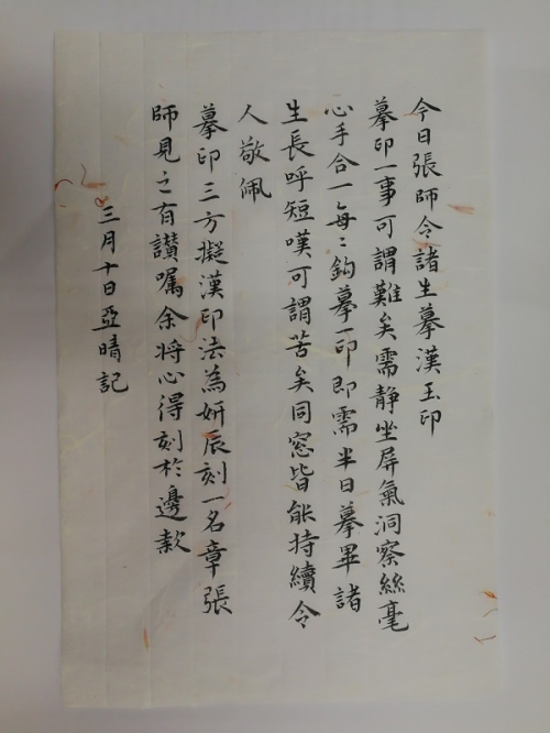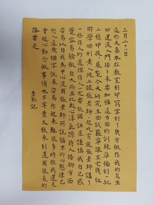 张师授课,点评吾等摹印作业。摹印一事可谓难矣,屏息之,静坐之,心细之,详观之...摹印方毕,吾等长呼短叹,眼花脖酸,然未见一人放弃,抬头转脖,继续勾摹。